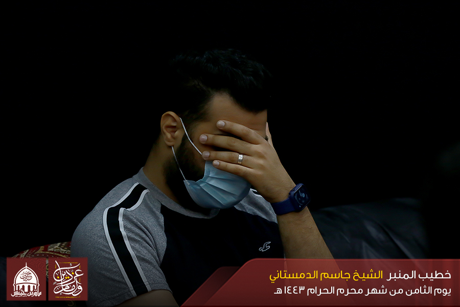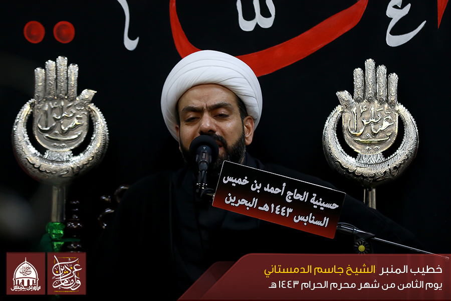 واصل سماحة الشيخ جاسم الدمستاني سلسلة مجالسه الحسينية بحسينية الحاج أحمد بن خميس ، وذلك في يوم الثامن من المحرم الحرام لعام 1443 ، وهو اليوم المخصص لرثاء شبل الحسن القاسم ( ع ) ، انْ تُنْكِرُوني فأنا نجلُ الحسَن ، سِبطِ النبيِّ المصطـفى والمؤتمَنْ ، هذا حسينٌ كالأسيرِ المرتهَنْ ، بينَ أناسٍ لا سُقُوا صَوبَ المُزُنْ . من العناوين المهمة في ثورة الحسين هو الخصائص الفكرية لعاشوراء ، وهذا العنوان الذي تندرج تحته مجموعة من العناوين و العبر التي بقراءتنا الواعية نؤسس لهذا العنوان ، لأنه سيفتح لنا أبواب تلك المواقف والعبر و أبواب تلك الدروس و المبادئ التي سطرتها ملحمة الحسين والخصائص هو ما اختصت به عاشوراء من مبادئ وعناوين ، ونلحظ ذلك في النصوص و ظواهر الروايات . وباستطاعتنا أن نراجع كتاب ( المنتخب في جمع المراثي والخطب لفخر الدين لطريحي ) .