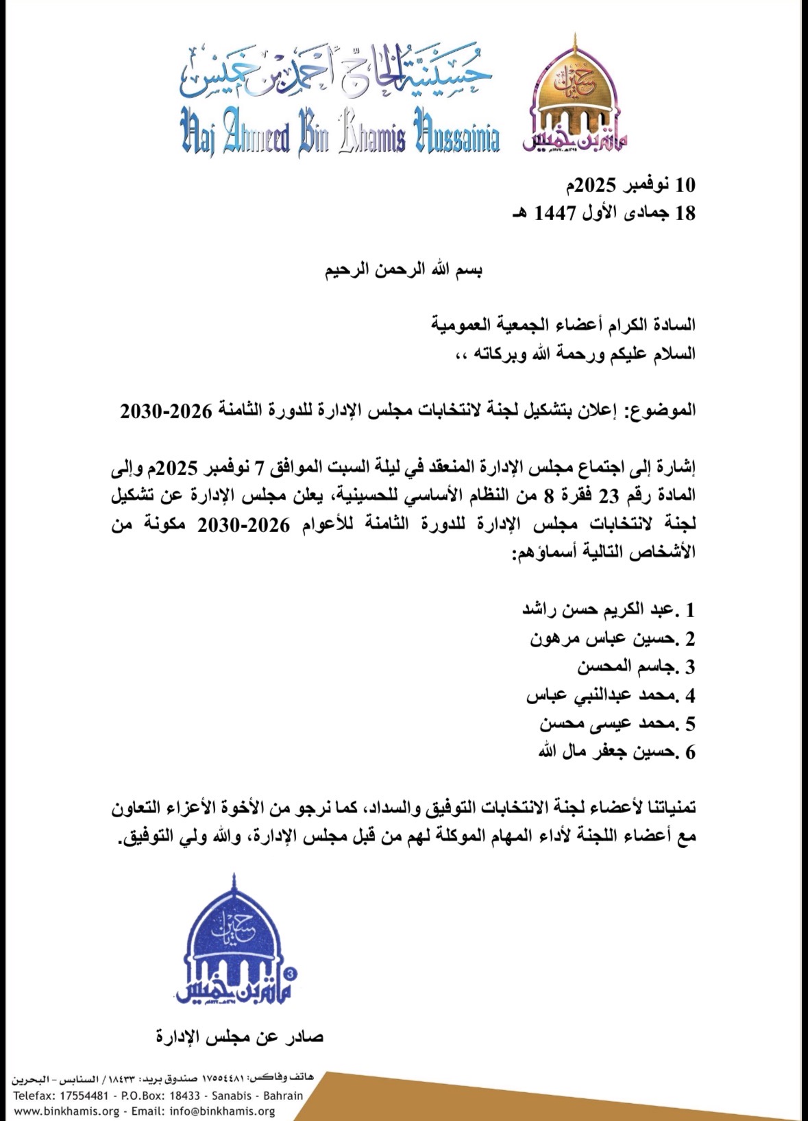 اعلان تشكيل لجنة الانتخابات للدورة الثامنة 2026/2030
