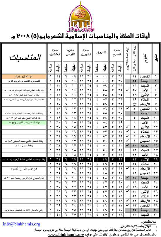 أوقات الصلاة والمناسبات الإسلامية لشهر مايو 2008م
