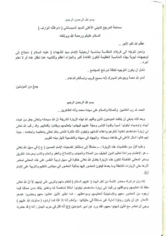 حصلت شبكة الكفيل العالمية من مكتب المرجع الديني الأعلى في النجف الأشرف سماحة آية الله العظمى السيد علي الحسيني السيستاني (دام ظله) على صورة الاستفتاء الذي وجه الى سماحته بخصوص توجيهاته إلى شرائح المجتمع كافة بمناسبة زيارة أربعينية الإمام الحسين عليه السلام عام 1435هـ.