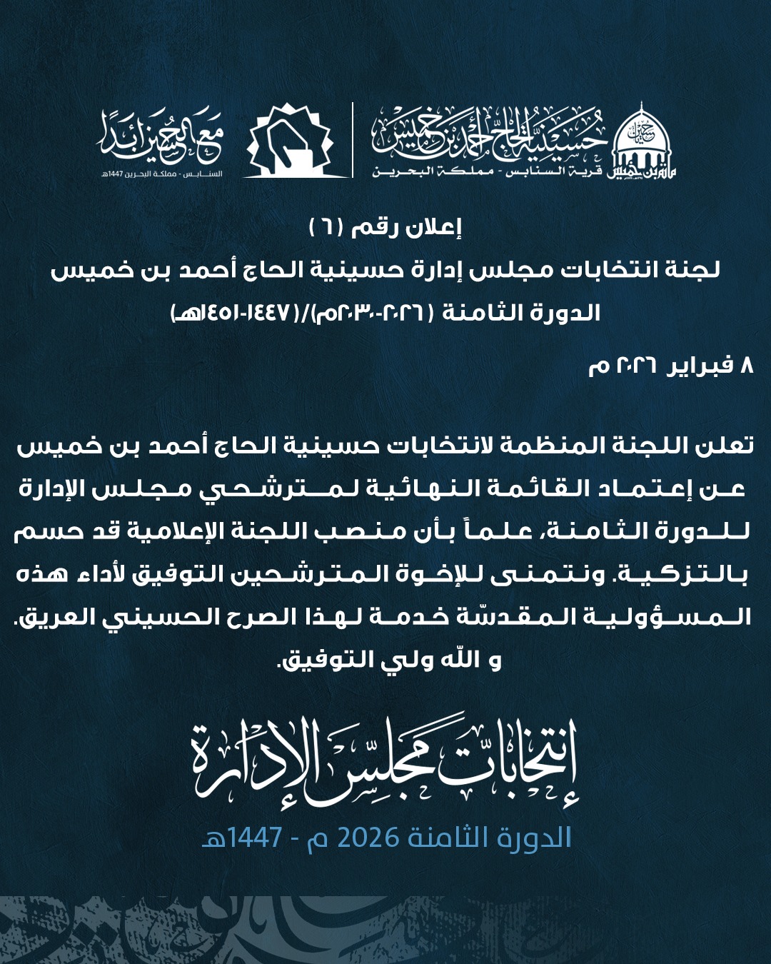 إعلان رقم (6) لجنة انتخابات مجلس إدارة حسينية الحاج أحمد بن خميس الدورة الثامنة (2026-2030م)/(1447-1451هـ)