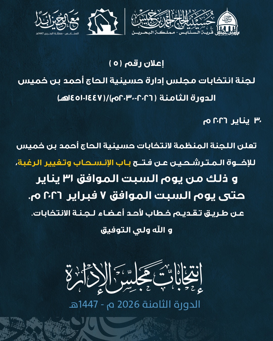 إعلان رقم (5) لجنة انتخابات مجلس إدارة حسينية الحاج أحمد بن خميس الدورة الثامنة (2026-2030م)/(1447-1451هـ)