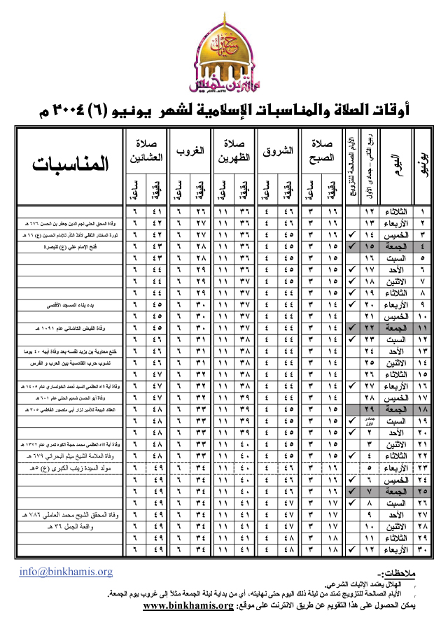 أوقات الصلاة والمناسبات الإسلامية لشهر يونيو 2004 م