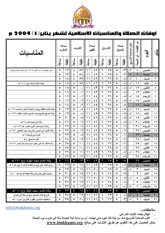 أوقات الصلاة والمناسبات الإسلامية لشهر يناير 2004 م