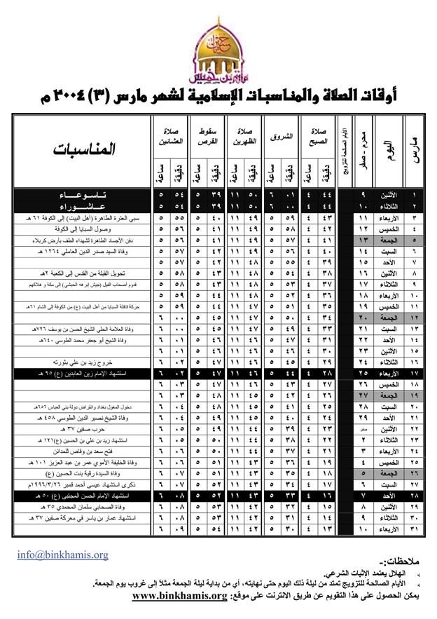 أوقات الصلاة والمناسبات الإسلامية لشهر مارس 2004 م