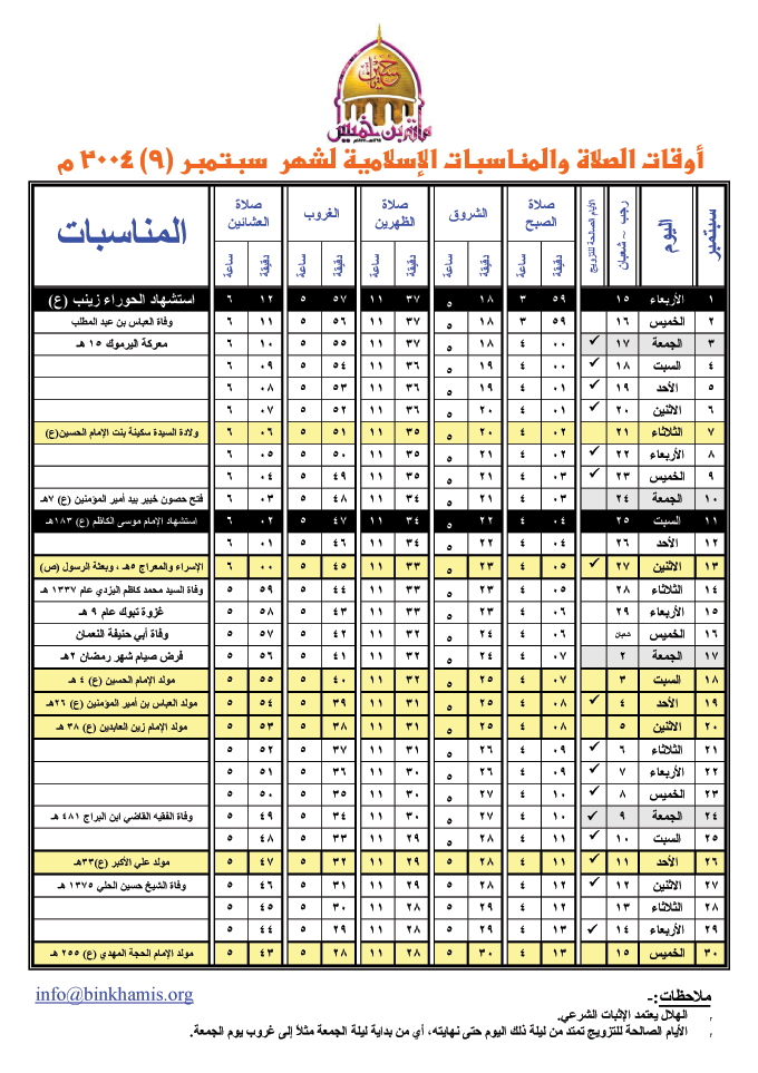 أوقات الصلاة والمناسبات الإسلامية لشهر سبتمبر 2004م