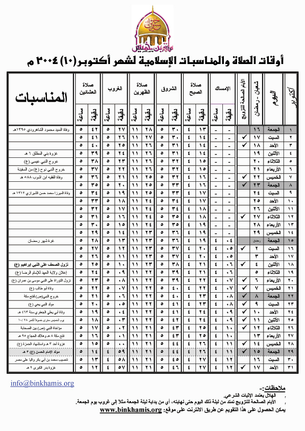 أوقات الصلاة والمناسبات الإسلامية لشهر أكتوبر 2004م