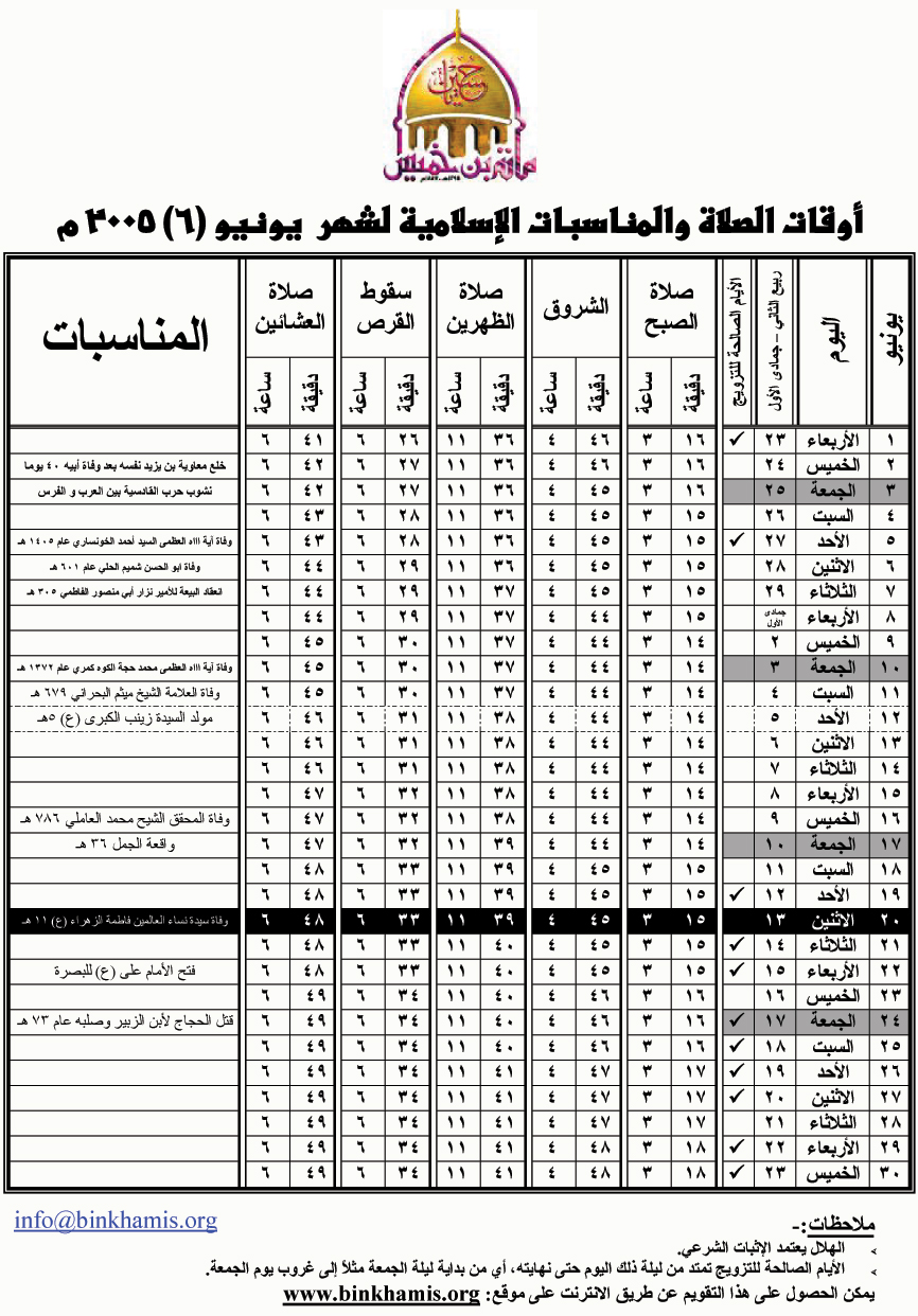 أوقات الصلاة والمناسبات الإسلامية لشهر يونيو 2005م